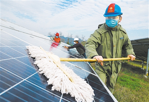 日前,湖北长阳县供电公司员工在长阳县合子坳村级光伏扶贫电站清理光伏板。 李 萍摄(中经视觉)
